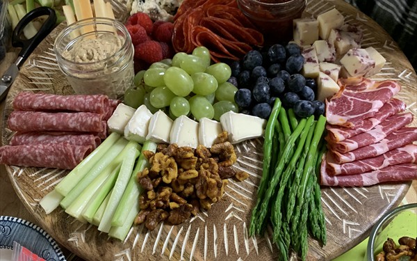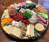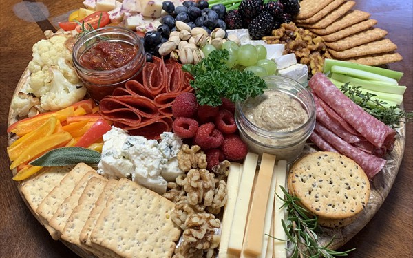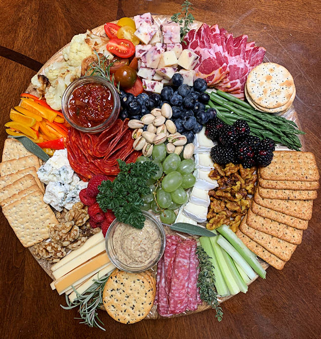 Various domestic and imported cheese, cured meats, whole grain mustard, dried fruits, nuts, mixed olives, crackers.